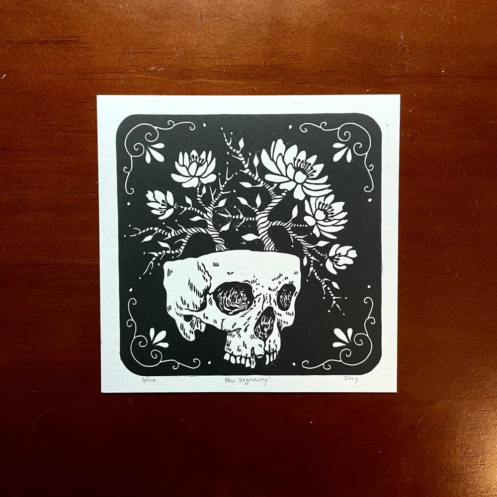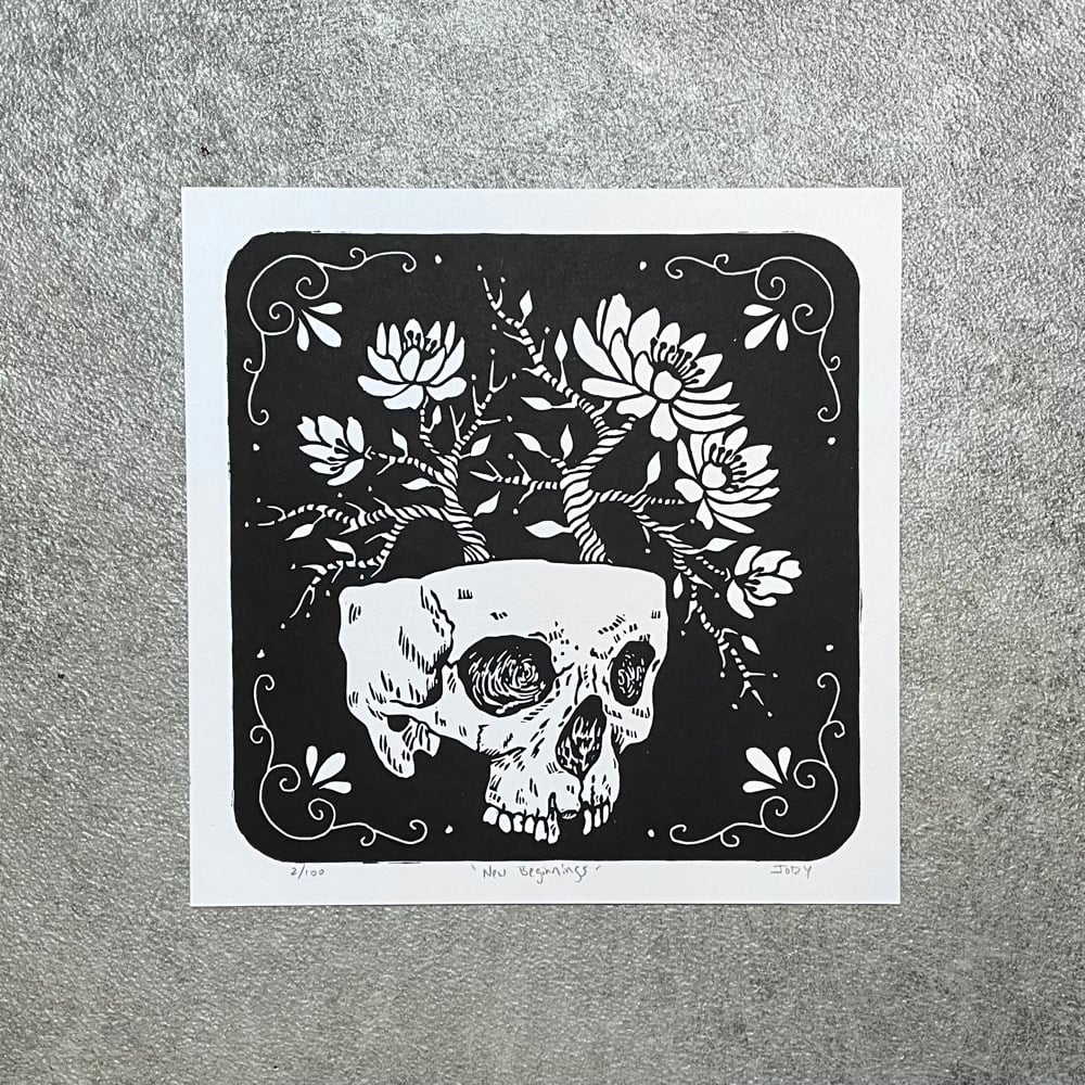 Flowers growing out of skull Linocut Print
