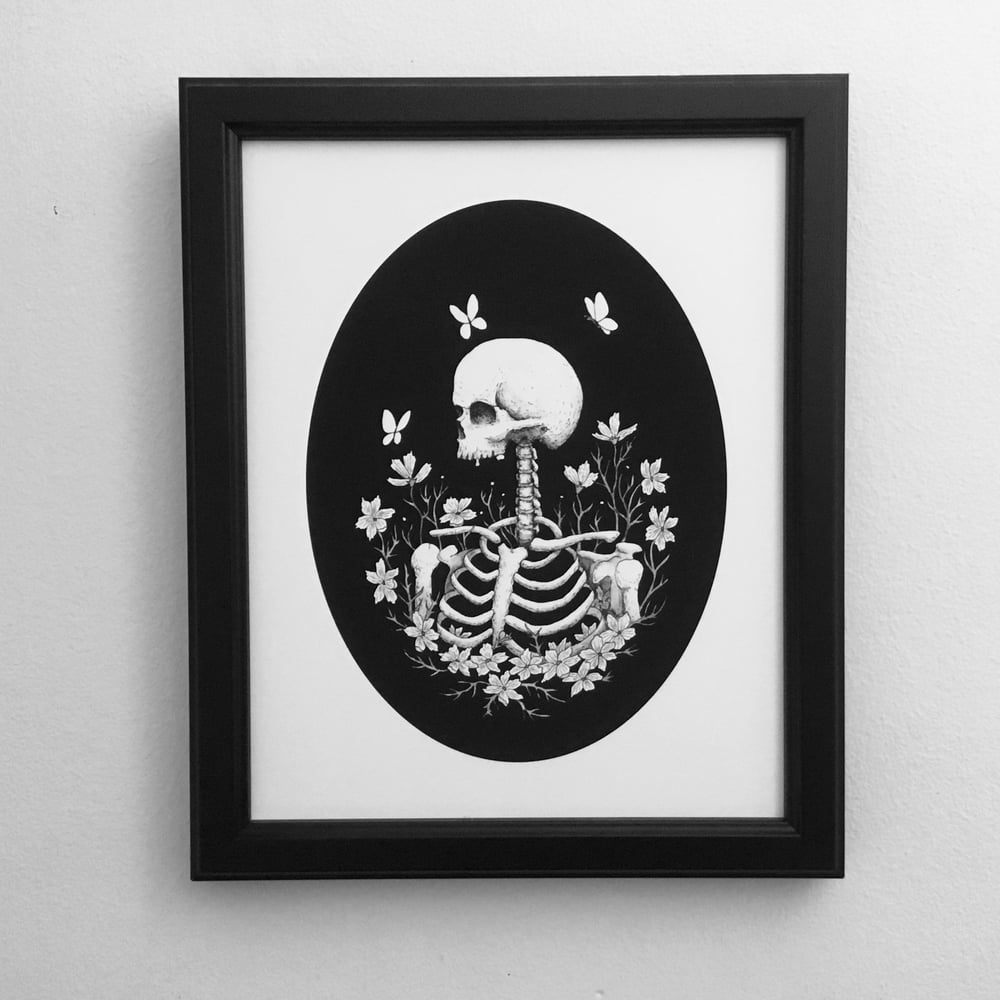 I am a dark artist living in central Wisconsin, US. The goal of my work is to contribute to the death positive movement by evoking discussion about the inevitability of death and to emphasize the beauty in darkness. My work can be seen as a modern memento mori, a reminder that one day we will die. It also serves as a reminder that death is a part of, and contributes to, life. In this particular piece, life and death are represented by skulls, plants, and flowers.