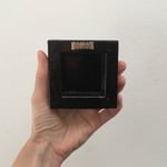 This linocut print has watercolor details and is mounted to a wooden cradled panel that is 3x3 inches. The wood is painted black and the entire piece is coated with a gloss varnish. On the back is a sawtooth hanger, making the plaque ready to hang on a wall. Props, stands, and curios shown in the photos are not included.